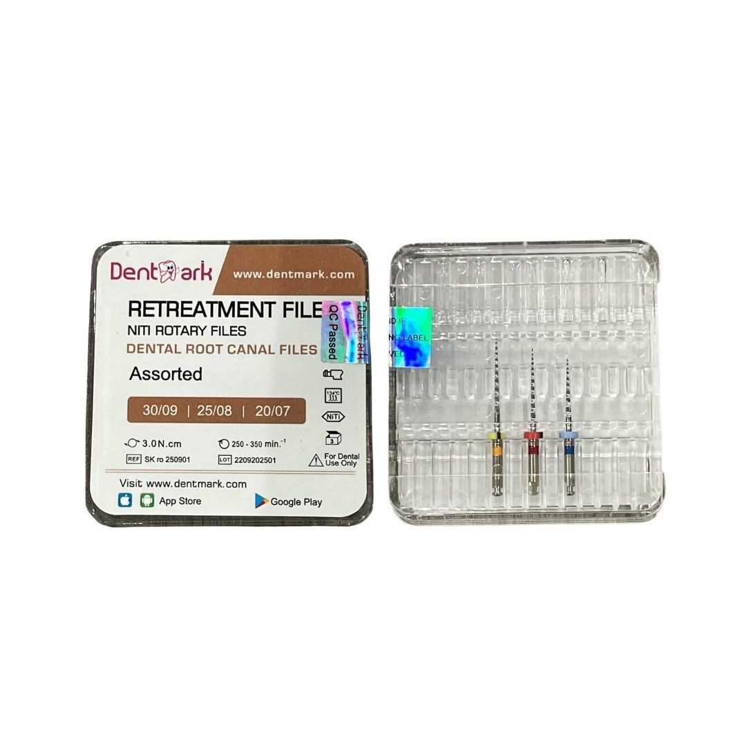DENTMARK DENTAL RETREATMENT FILES: NiTi retreatment files are used to remove the gutta percha, carrier-based obturators or filler paste before reshaping of canal. The procedure is same to remove carrier-based obturator or gutta percha alone.