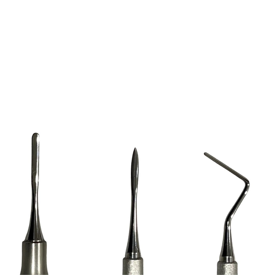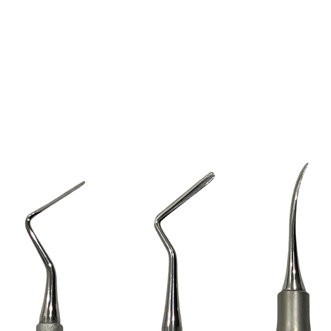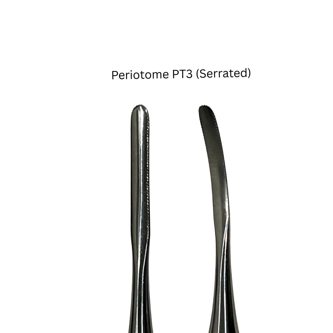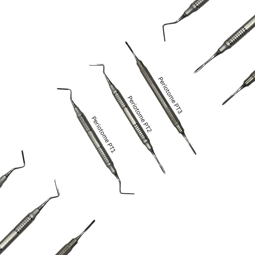 Periotome featuring thin sharp blades used to facilitate the removal of teeth with minimal damage to the surrounding alveolar bone by severing the periodontal ligament. May be used wherever an extract is indicated but are particularly important when considering the placement of a dental implant.
