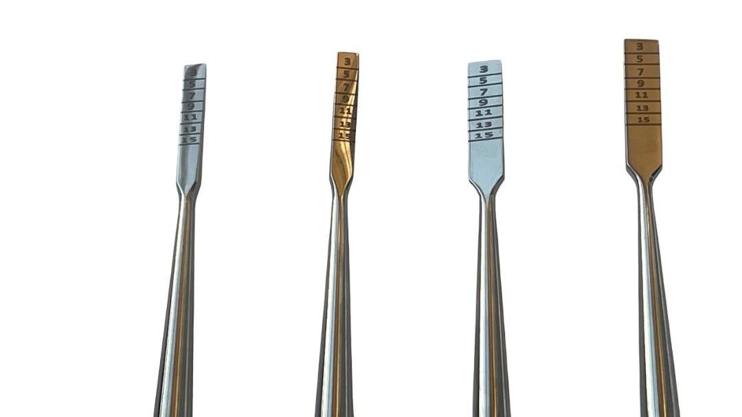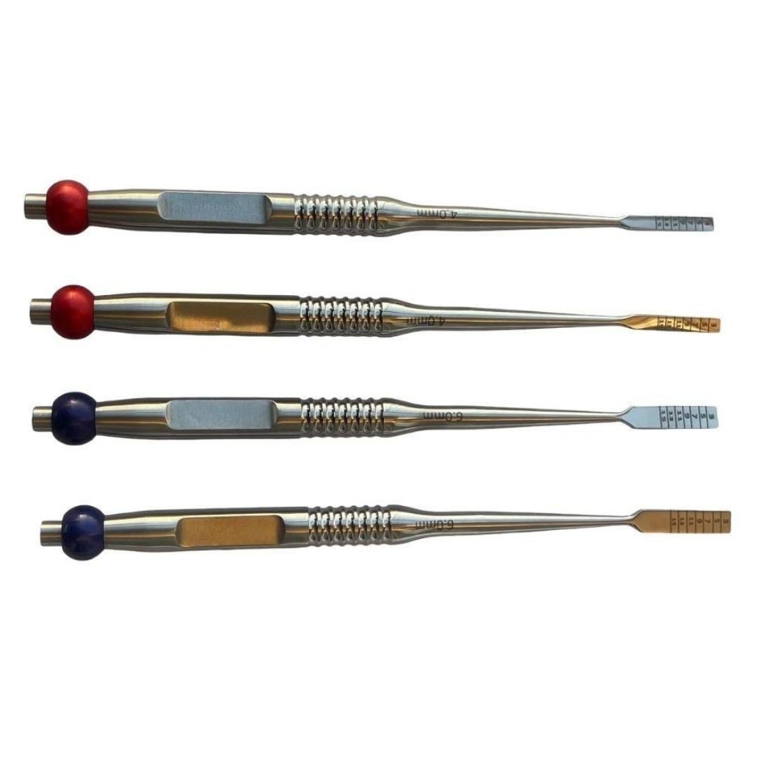 The set includes 4 variations—4 mm and 6 mm blades in both straight and curved designs—to accommodate various surgical needs. Each chisel features laser-etched depth markings for accurate bone measurement and color-coded ergonomic handles for easy identification and superior grip.