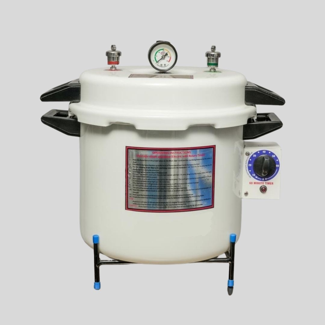 This steam sterilizer is designed for safe and effective sterilization of medical and dental instruments. With a 23-liter capacity and preset operating temperature of 121°C at 15 PSI, it ensures consistent and reliable sterilization performance. The unit features a durable epoxy powder-coated, rust-proof body, high-efficiency heating element, and seamless gasket for leak-proof operation. Equipped with an inbuilt alarm and a 60-minute mechanical timer, it offers enhanced safety, ease of use, and dependable operation for clinics, hospitals, and laboratories.