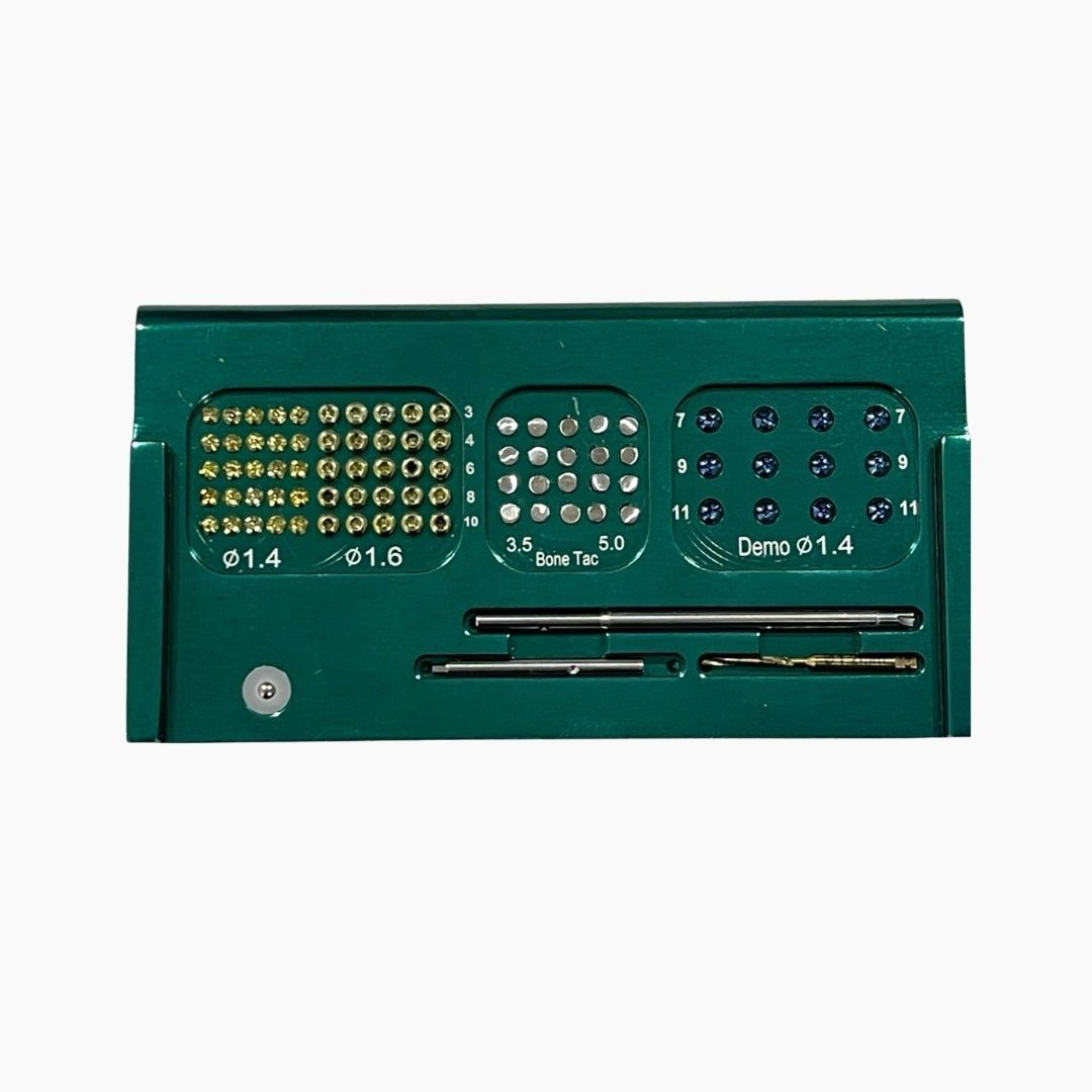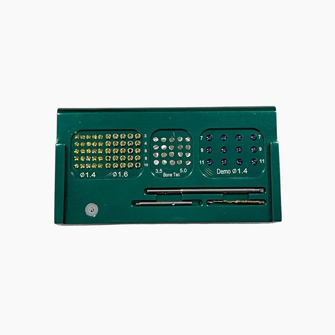 The GBR Titanium Fixation Kit is a comprehensive surgical solution for membrane stabilization, bone graft fixation, and space maintenance in Guided Bone Regeneration (GBR) procedures. Designed for implant surgeons performing advanced bone augmentation, this system combines solid fixation screws, dome (tenting) screws, and bone tacs in one organized surgical kit.