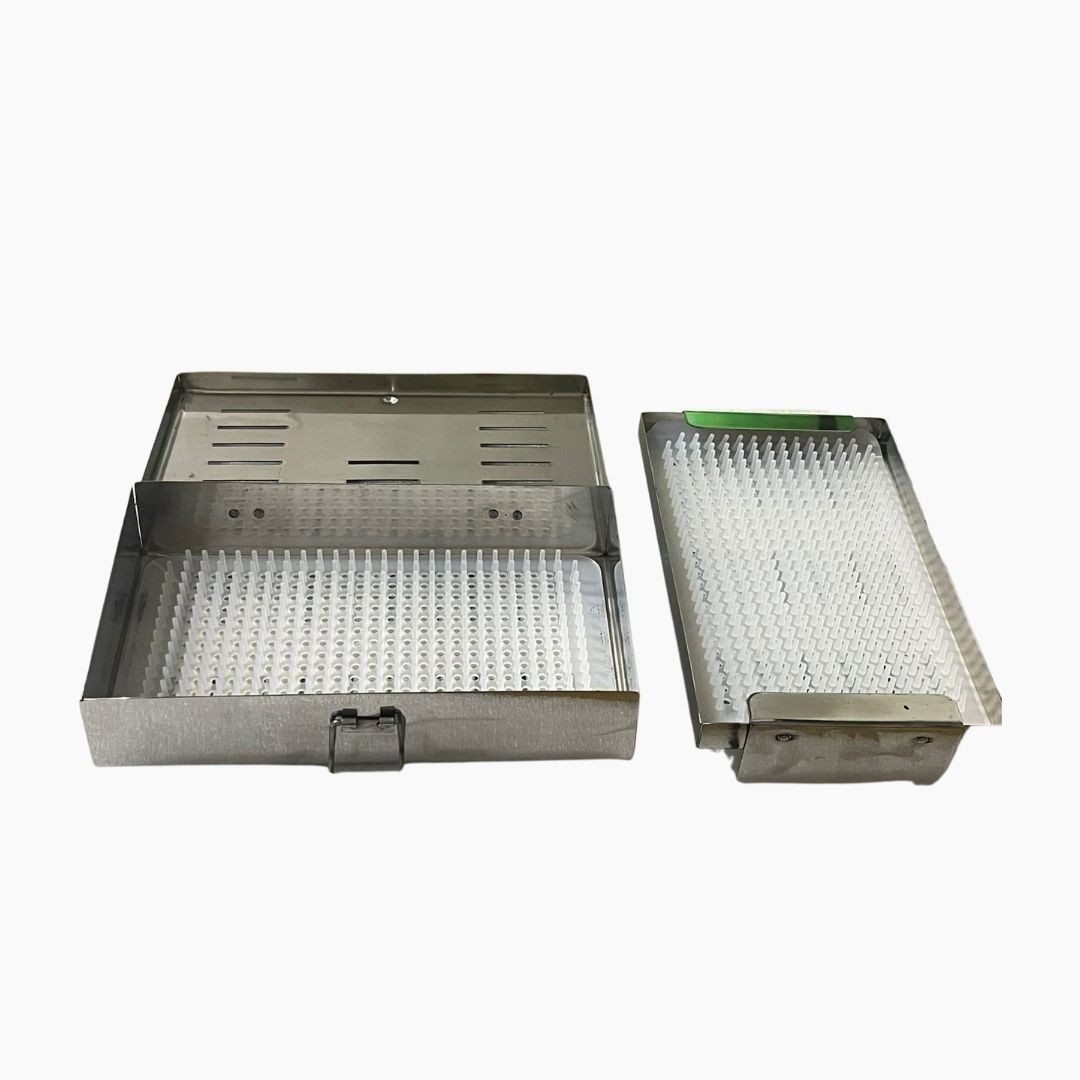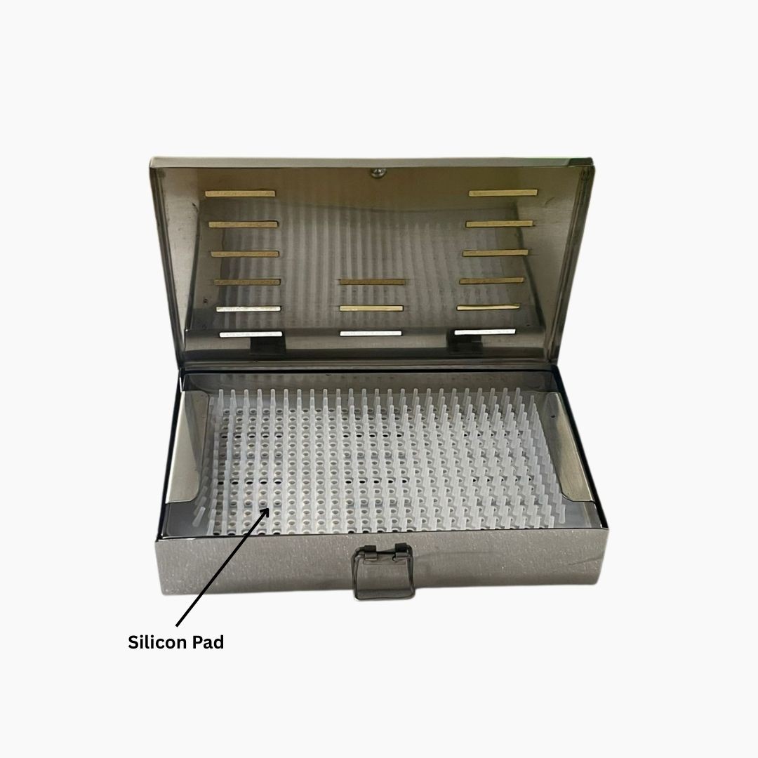 The Sterilisation Cassette with Stand and Silicone Pad is designed for safe storage, organization, and sterilization of dental and surgical instruments. Made from high-quality stainless steel, it ensures durability and long-term performance. The silicone pad securely holds instruments in place, preventing movement and damage during sterilization. Ideal for clinics, hospitals, and dental setups for efficient instrument management.