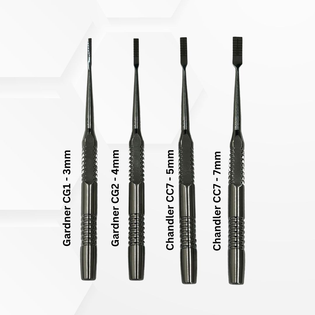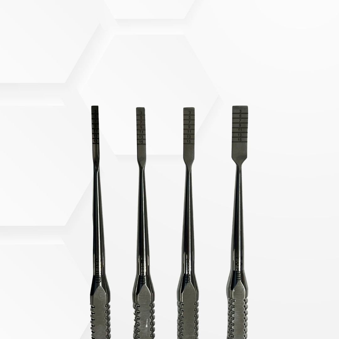 Dentmark Bone Chisels are precision-crafted surgical instruments designed for controlled bone cutting, shaping, contouring, and ridge expansion during oral and implant procedures. These chisels provide excellent handling, sharp cutting efficiency, and precise depth control with engraved measurement markings. Ideal for implantology, oral surgery, and bone grafting procedures, the ergonomic handle ensures a secure grip and improved surgical accuracy. Available in multiple tip sizes and patterns including Gardner and Chandler designs